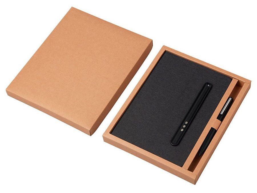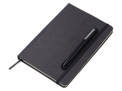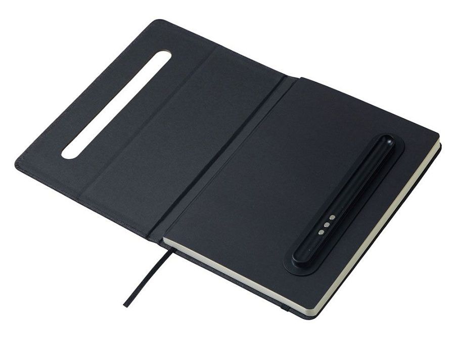 Блокнот в твердой обложке из rpet-пластика с металлической шариковой ручкой. В обложке магнитный держатель для ручки. Также верхняя часть обложки трансформируется в подставку для телефона.