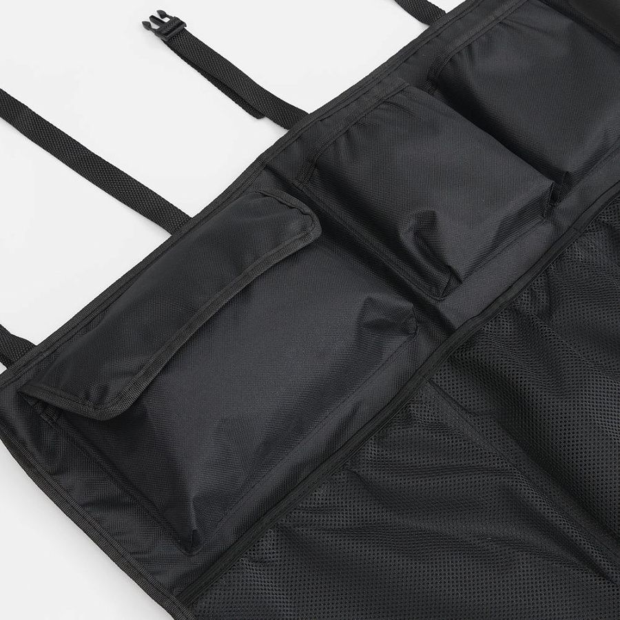 В органайзере имеются разные по форме и типу карманы: карманы-сетки, карманы с крышкой на липучке и открытые карманы. Конструкция крепится ремнями за подголовники задних сидений. Дополнительно на его задней части имеются ленты-липучки, которые обеспечивают полное прилегание к спинкам задних кресел.