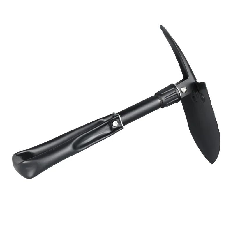 Складной, небольшой размер, легко носить с собой. После разворачивания один конец представляет собой лопату, а другой — кирку. Он сгибается и складывается, а ручку можно использовать как горизонтально, так и вертикально.