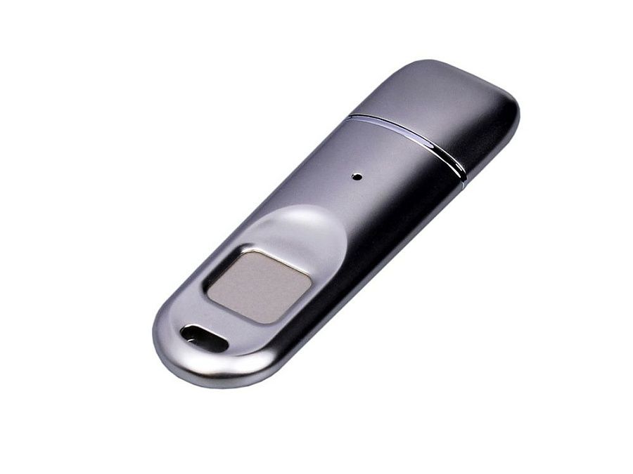 Классическая металлическая флешка с колпачком и сканером отпечатков пальцев.