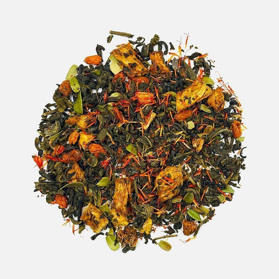 Состав: чай зеленый с ананасом и соком ананаса (чай зеленый байховый крупнолистовой, кусочки ананаса, сок ананаса), цветки сафлора, толокнянка, облепиха сублимированная, ароматизатор натуральный Персик, ароматизатор натуральный Груша.