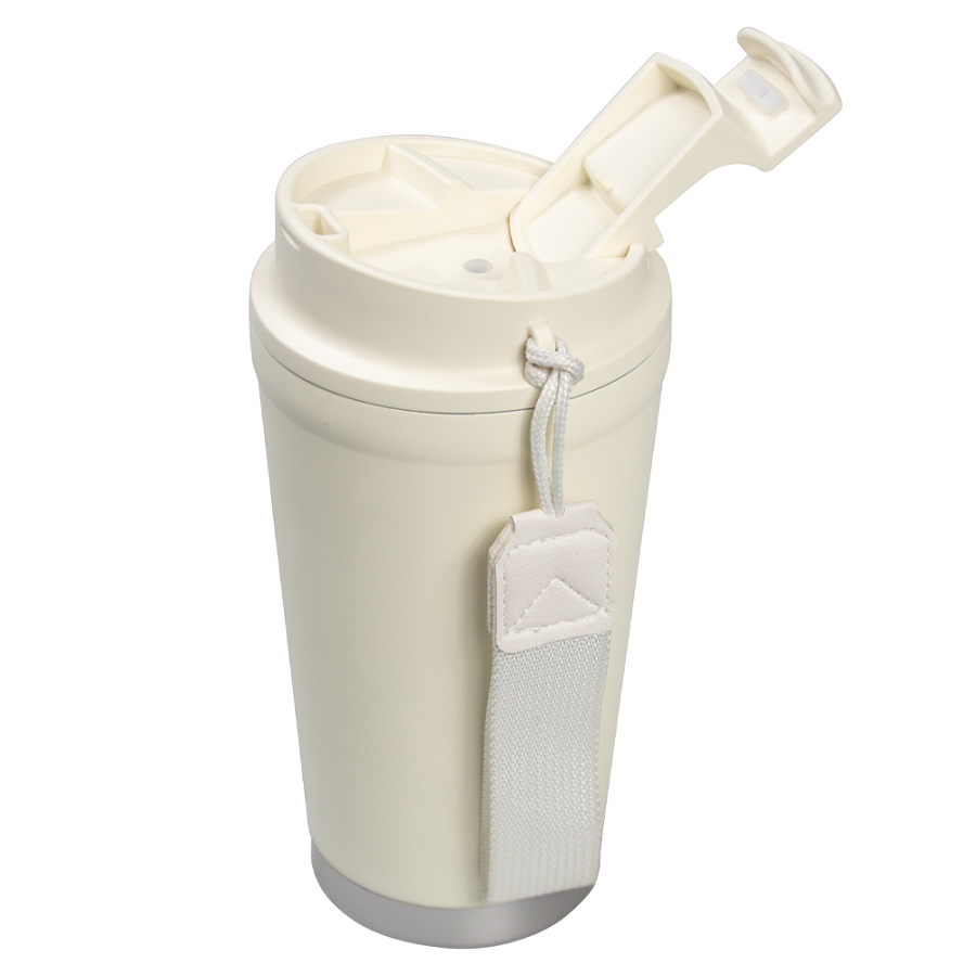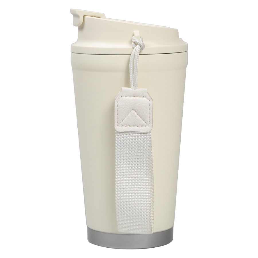 Металлическая термокружка объёмом 410 мл с матовым покрытием и контрастным металлическим основанием. Оснащена герметичной крышкой с откидным клапаном и удобным ремешком для переноски. Поддерживает температуру напитков и подходит для использования в дороге, на работе и в путешествиях.